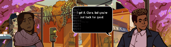 The stakes are personal – Clara wants to make the world a better place, but she’s torn in multiple directions by her love of learning and experiencing new things, and there are no simple answers. Help her take control of her narrative as she uses elemental powers to learn more about herself, her relationships, and how she can become part of a larger tapestry. Even in a well-meaning interconnected society, she may be the one to spot a loose thread before it unravels Jacarandá’s peace and tolerance.