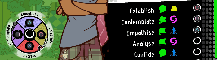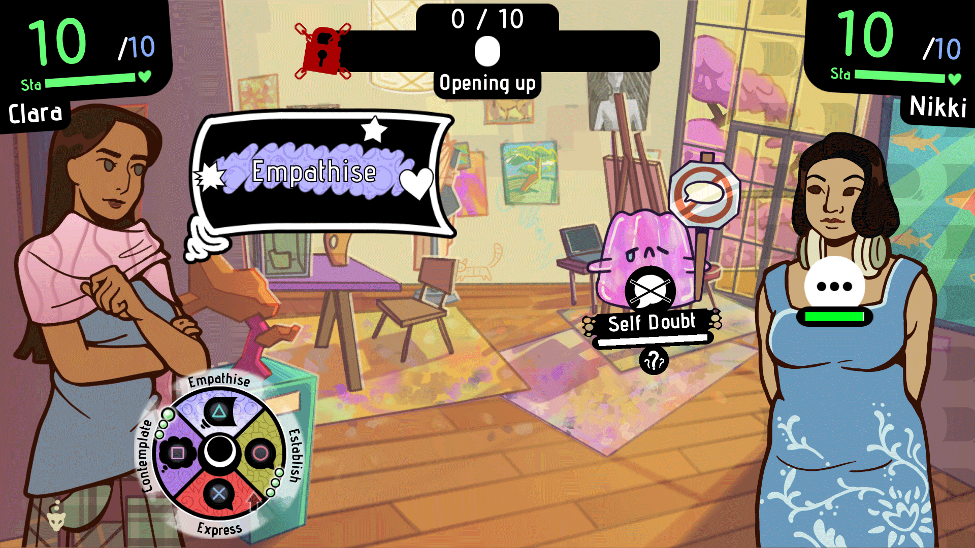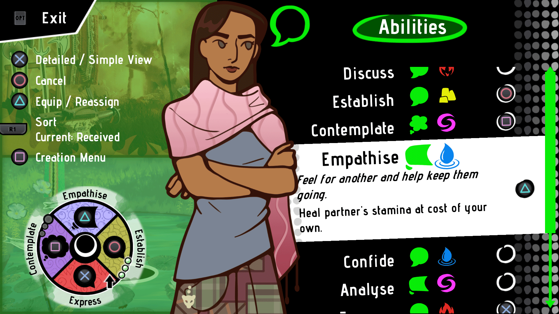 Do you stay safe by Contemplating your options while Establishing your boundaries and defences? Or do you risk yourself to heal your partner by Empathising, only to turn a tough situation around by Expressing your feelings when your back is to the wall? Equip abilities which speak to you, then act and react to balance the shifting needs of each conversation.