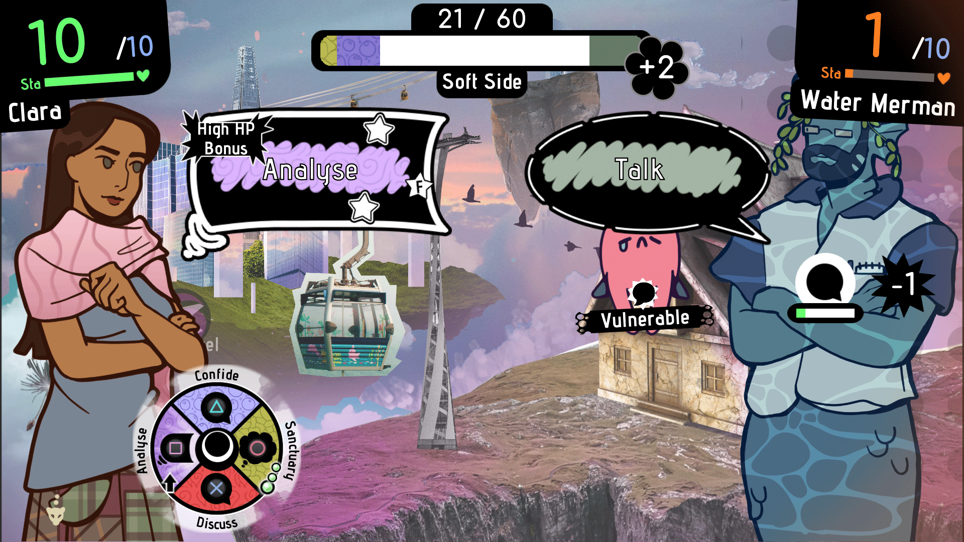 Dive into inner worlds shaped by people’s minds and personalities, and explore Clara’s own multi-faceted identity through rich dialogue and active conversation encounters, giving narrative and strategic depth to the story’s personal and emotional stakes. Immerse yourself in a magical Solarpunk setting of self-sustaining but interconnected commonships, and the people responsible for making it work – or fall apart.